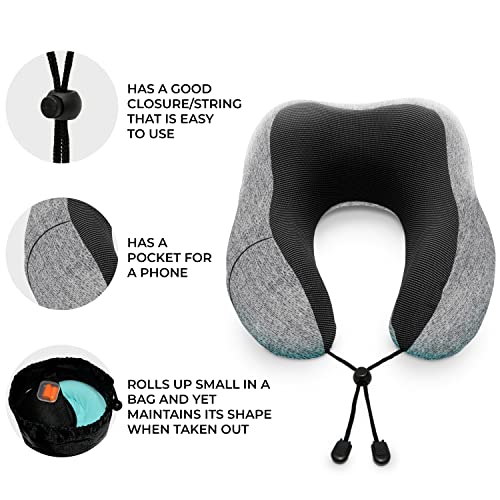 Subrenna Grey 100% Memory Foam Travel Pillow, Airplane Pillow with Eye Mask and Ear Plugs for Sleeping – Supports Neck & Head in Airplane, Bus, Train and Car